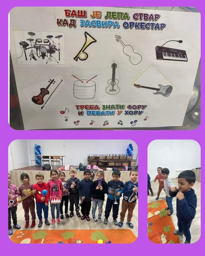Деца су развијала осећај за ритам,слушали су песме различитог ритма, а онда су ,,хватали ритам” тапшући у ритму, лупкајући ногама итд. Деци смо понудили музичке инструменте које смо позајмили од другара из вртића.Из кутије су вадили један по један инструмент, именовали их, а након тога су исте те инструменте и свирали. Желели су да знају шта је то оркестар и шта је то хор. Свако дете је одабрало инструмент и направили смо наш оркестра. Родитеље упознајемо са пројектом тако што им шаљемо писмо и дајемо им задатак да заједно са децом из часописа и новина пронађу нешто од инструмената везаних за музику. Организовали смо посету Музичкој школи ,,Стеван Мокрањац“. Деца која похађају ову школу су нас дочекала уз лепе мелодије свирајући на разним инструментима, а наши предшколци су пажљиво слушали и гледали. Као мали знак пажње ,деца су припремила рад ,а то је виолински кључ направљен отискивањем њихових прстића. Деца су своје музичке таленте представила и својим другарима ,,Деца деци”.
