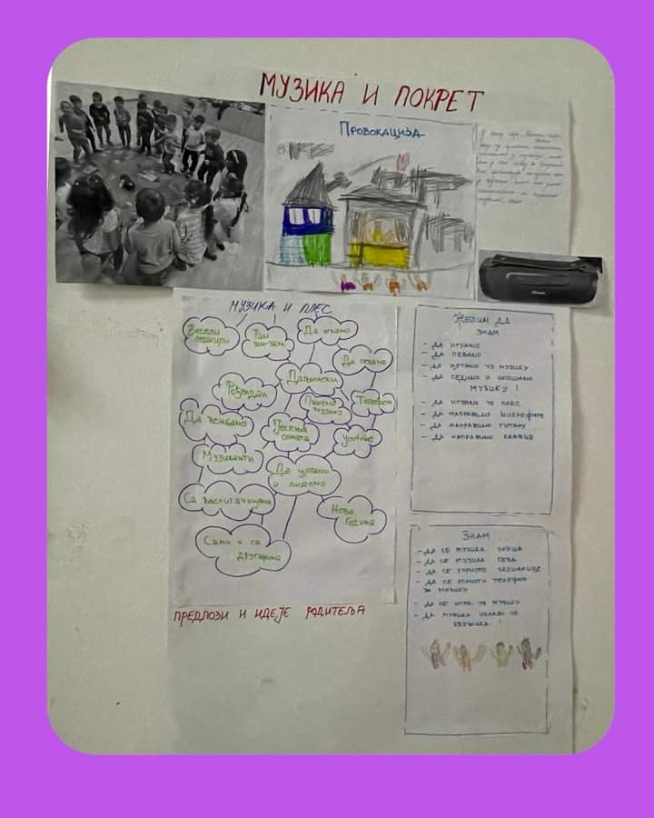 У току игре ,,Покажи шта знаш” деца су показивала таленат у музици, што нам је био повод за пројекат. Као провокација послужио нам је звучник који смо искористили даље за слушање музике,плес… Пројекат нас је даље водио ка свакодневном слушању музике, свакодневном телесном вежбању уз музику, цртању уз музику…