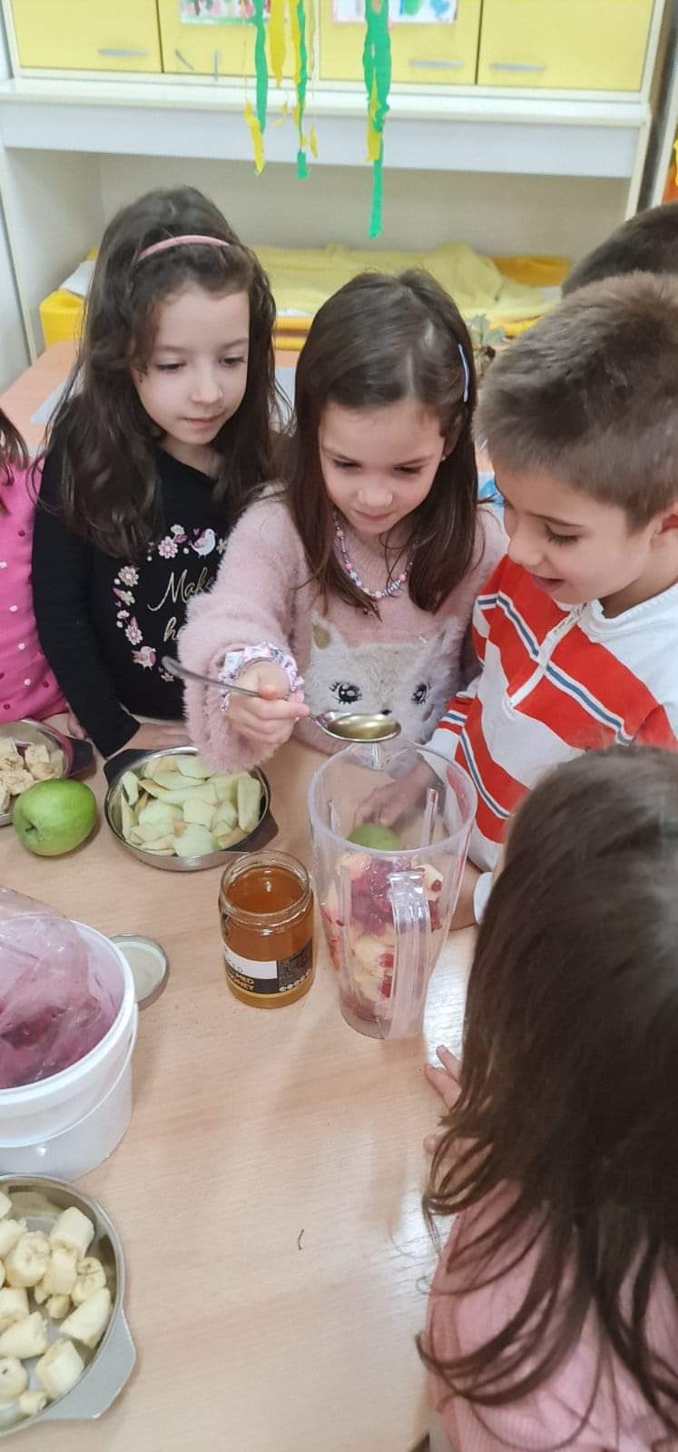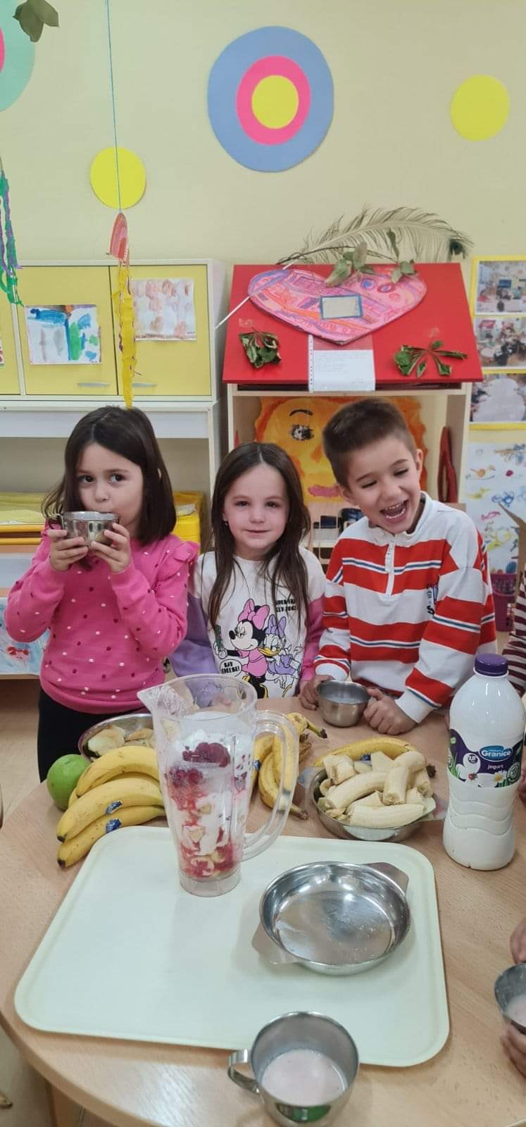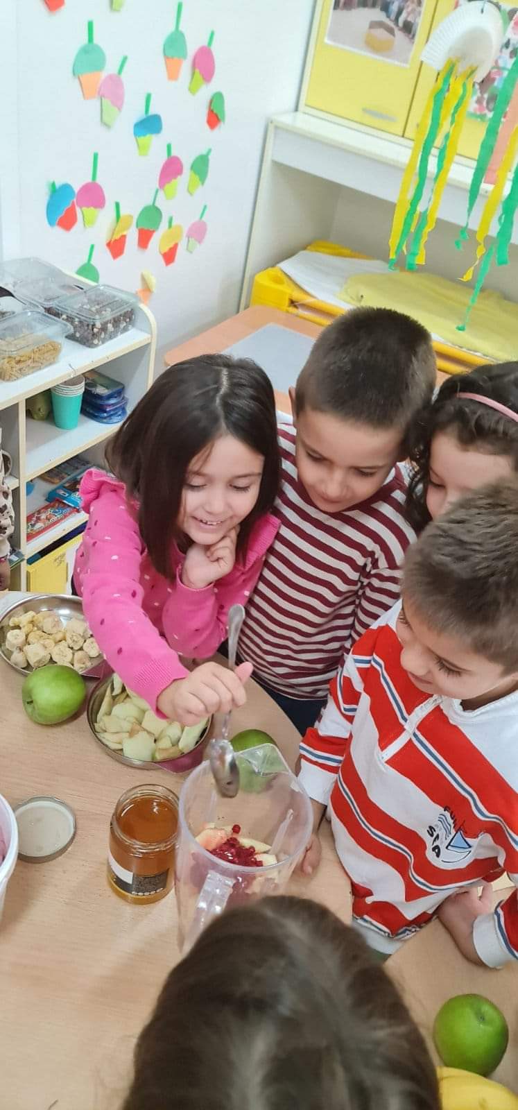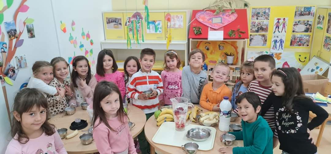 Светски дан здраве хране обележен је у вртићу “ Душко Радовић“ радионицама о значају здраве хране и стварању здравих навика у исхрани. Заједничким снагама припремили смо здрав оброк и у његовом укусу уживали. Рецепт за наш смути: банане, јабуке, микс црвеног воћа, јогурт и наравно мед. ❤️
